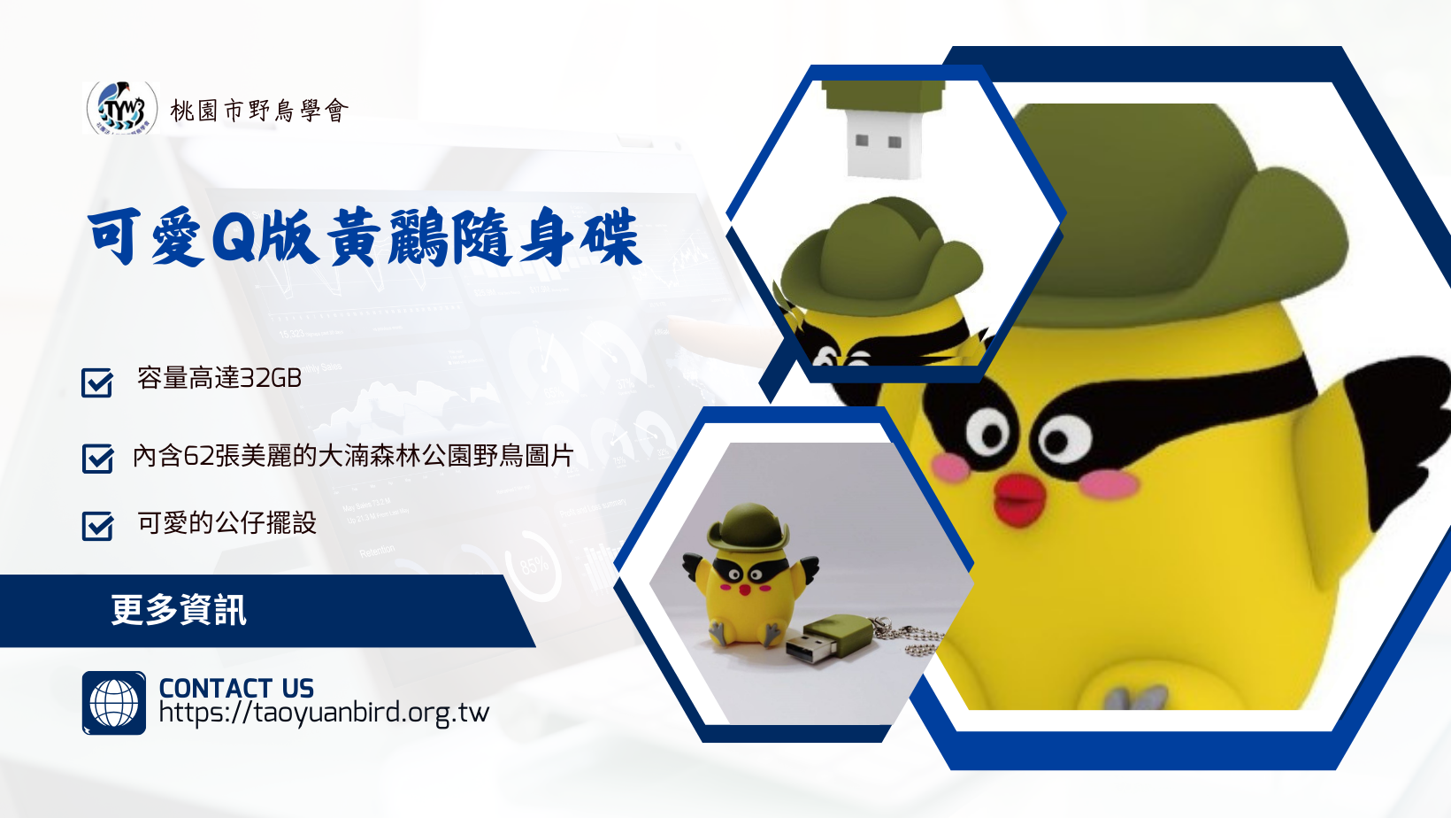 🎉 **小小隨身碟,大大用途** 🎉 這款Q版黃鸝鳥造型隨身碟,不僅是一個32G的資料儲存工具,更是一件美麗的公仔!內含62張大湳森林公園的鳥類圖片,讓您隨時欣賞大自然的魅力。無論是送禮還是自用,都是讓人心動的選擇!幫助我們守護野生動物,現在就來訂購吧! 💵 價格:300元/組